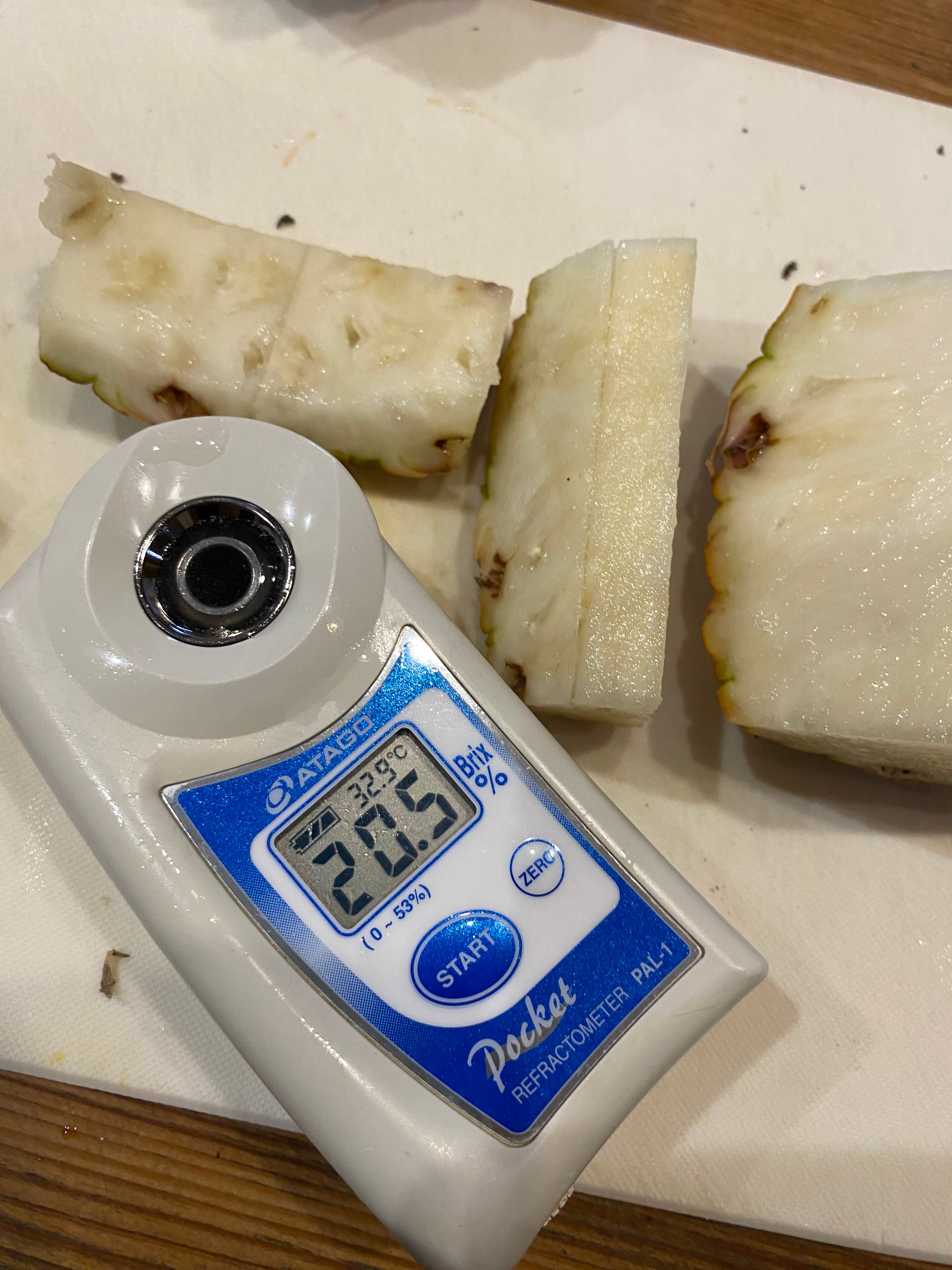 ※今シーズン3月31日の時点で、ポコットパイン、ピーチパインともに最高糖度20度記録いたしました。(全ての個体の糖度を保証するものではありません。)